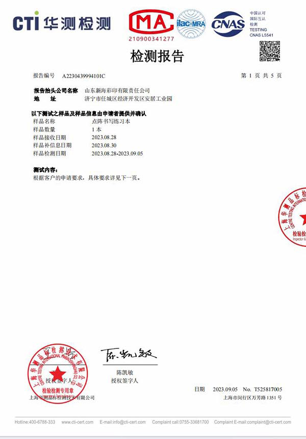 點陣書寫本檢測報告